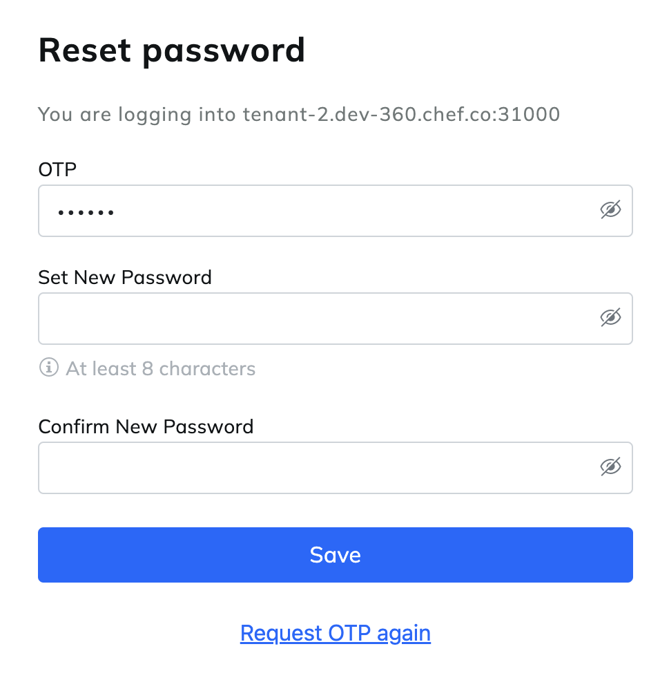http://<TENANT_FQDN>:31000/app/login/forgot-password, enter your email address, and select Forgot Password.Chef 360 Platform sends an email to your email address with a link to reset your password.